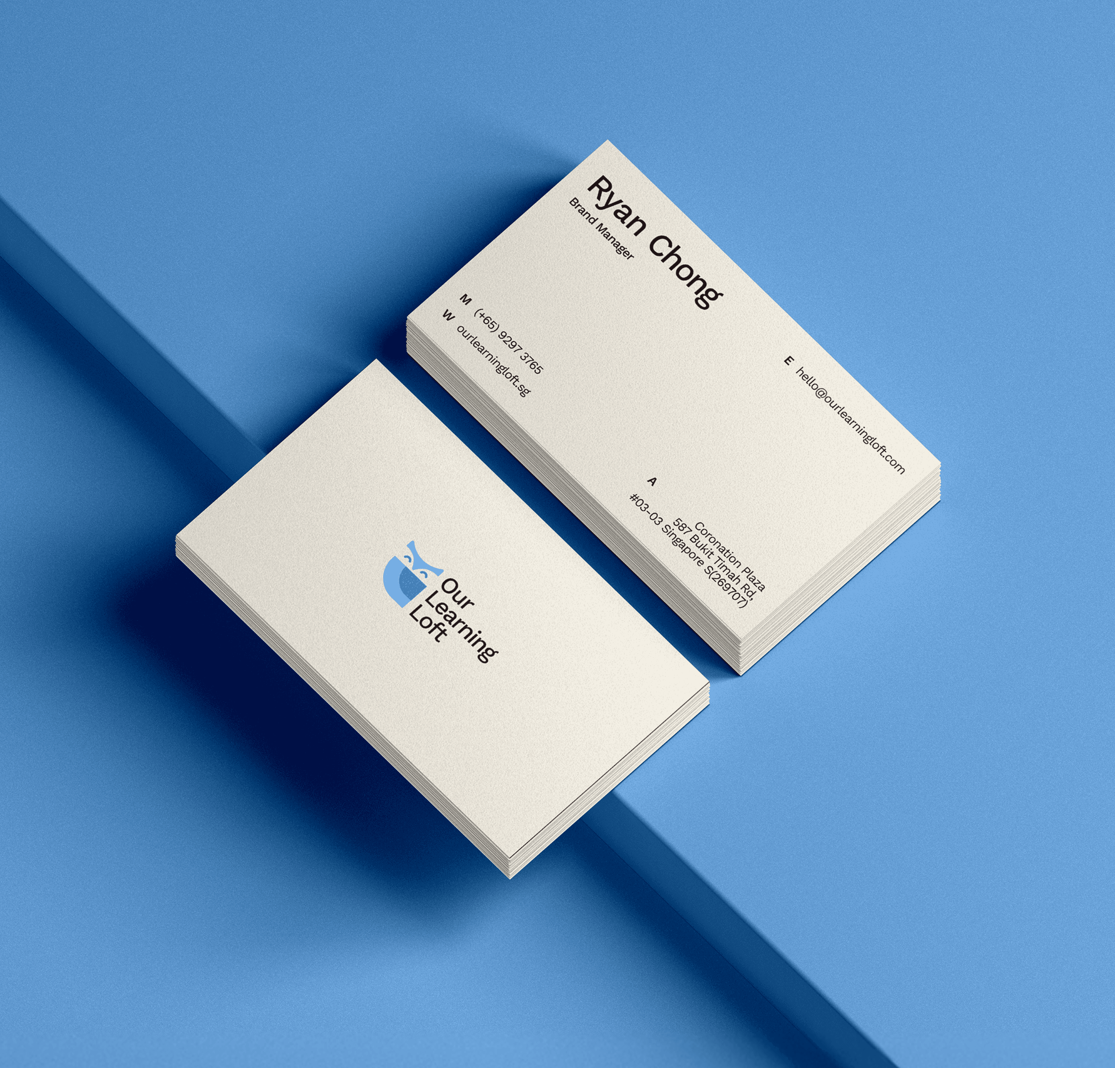 The design uses OLL's primary sky blue palette and sits comfortably across every application — from a favicon to a centre signboard. The rationale was simple: Singapore's education market is serious. OLL's differentiator is that they're warm, human, and genuinely encouraging. A well-designed mascot communicates that in an instant.